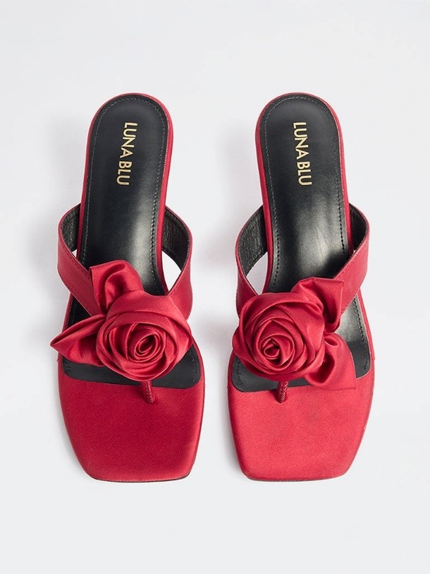 Luna Blu sandals make a bold statement with a rich red finish and sculpted floral embellishment at the strap, echoing the romance of Valentine hues. The satin-like texture adds depth and visual interest, catching the light with a subtle, love-struck sheen, while the contoured cushioned insole offers lasting comfort for moments that linger. Finished with a sturdy outsole, the design balances striking detail with refined structure perfectly blending confident elegance with a hint of Valentine charm.