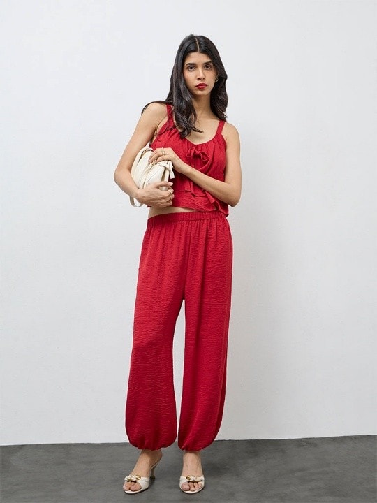 LOV Red Crinkle Textured High-Rise Harem Pants (Rs. 1499)