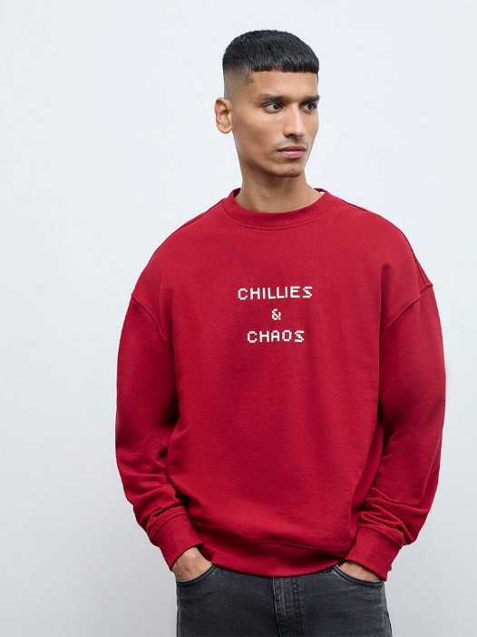Nuon brings a fun and love-infused addition to your winter-wear wardrobe with this red sweatshirt. It showcases playful text prints at the front and bold chilli motifs at the back for a standout statement.